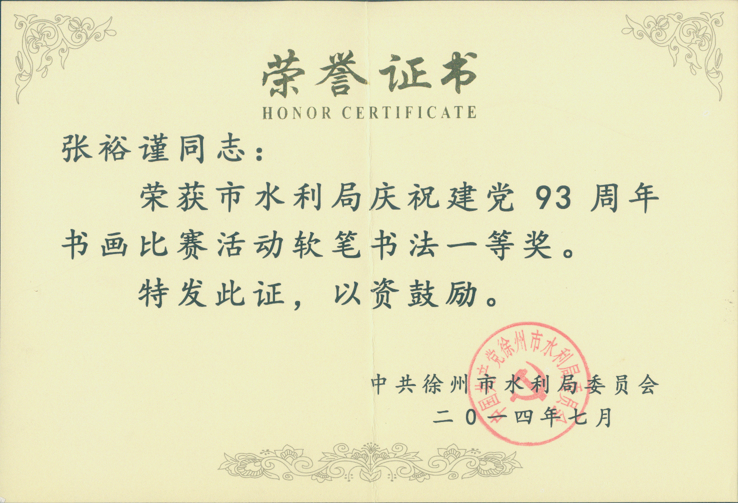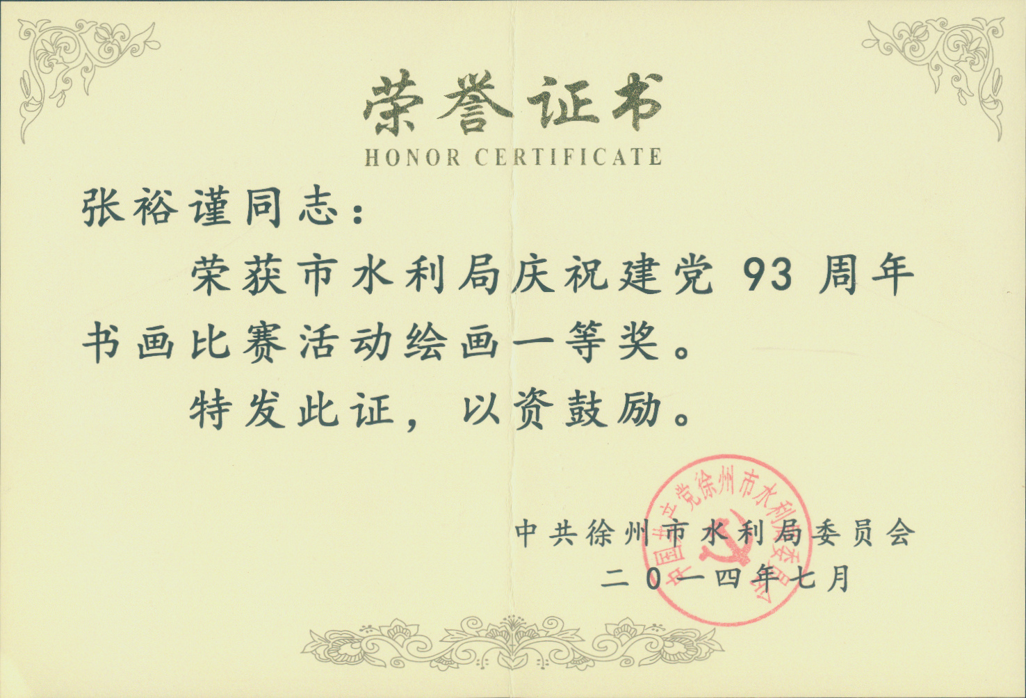 我院職工獲得市水利局“慶祝建黨93周年書(shū)畫(huà)比賽”一等獎