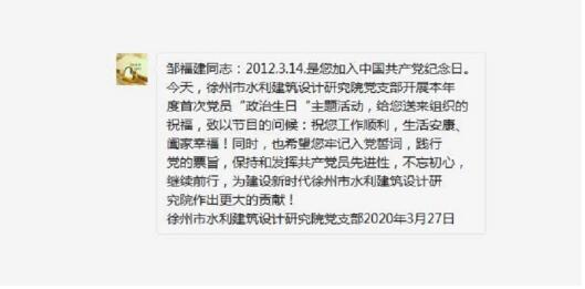 三是開(kāi)展“過(guò)政治生日,強初心使命”活動(dòng)。我院共有五名黨員入黨周年紀念日在一季度,院支部通過(guò)向五位同志發(fā)送祝福短信、支委頒發(fā)政治生日賀卡等活動(dòng),鼓勵他們能夠“不忘初心,牢記使命”,為設計院、為徐州水利水務(wù)事業(yè)做出更大的貢獻。另外,我院全體黨員面對黨旗進(jìn)行了入黨宣誓,期待在新的一年能取得更大的進(jìn)步。